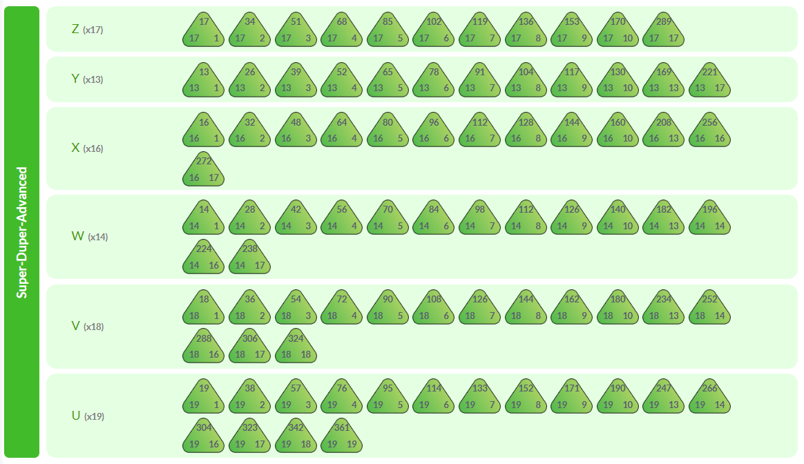 Super-duper-advanced multiplication challenges even the most capable students (and their teachers) by helping them to efficiently solve x19, x18, x14, x16, x13 and x17 facts, also up to __x20.
