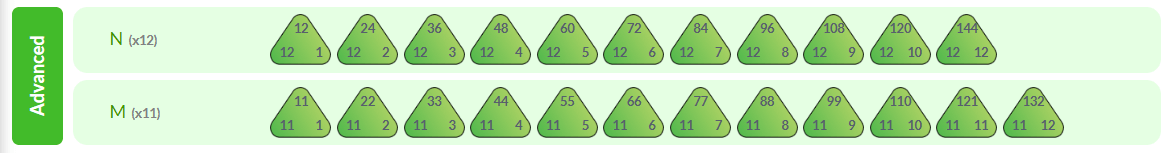 In the advanced program multiplication and division stage, students learn x11 and x12 facts, up to 12x12. These are Levels M (x11) and N (x12).
