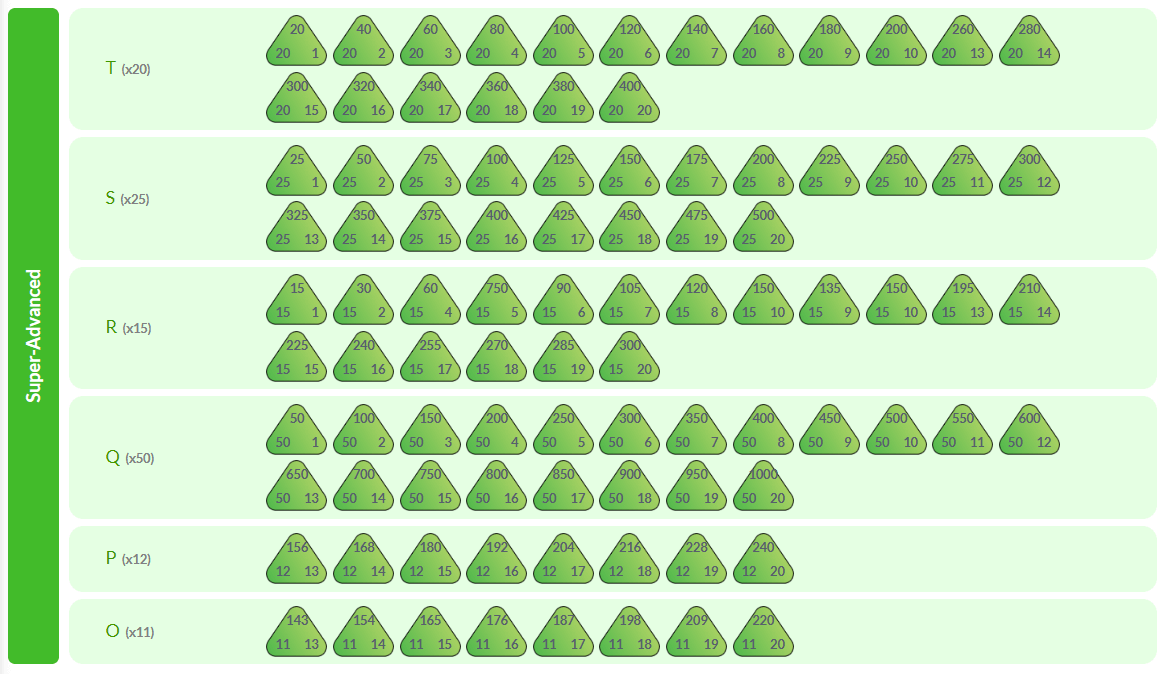 In the super-advanced multiplication stage, students extend their knowledge of elevens and twelves up to 12x20. They then go beyond tradition by working on strategies to develop fluency with x50, x15, x25 and x20 facts, again up to __x20.